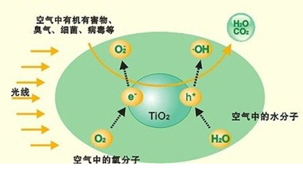 光触媒在光的照射下,会产生类似光合作用的光催化反应,产生出氧化能力极强的自由氫氧基和活性氧,具有很强的光氧化还原功能,可分解各种有机化合物和部分无机物,能破坏细菌的细胞膜和固化病毒的蛋白质,,把有机污染物分解成无污染的水(H20)和二氧化碳(C02)。